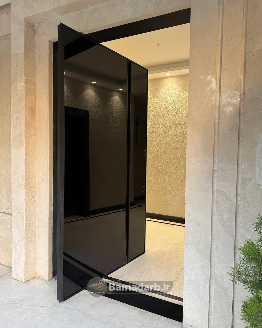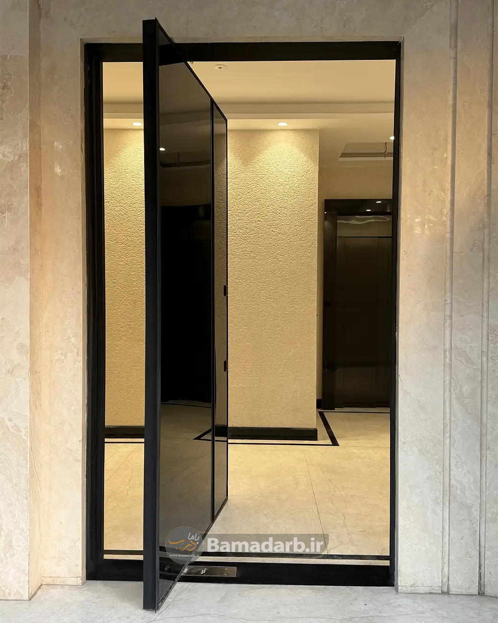 در بخش ورودی دیگر، از درب پیوت الین تمام سکوریت لمینت شیشهای استفاده گردید. این درب پیوت شیشهای با چهارچوب ورق ۲ میلیمتری، قفل کاله ترکیه و لولای پیوت دُرما آلمان مجهز به استپ و آرامبند، علاوه بر استحکام بالا، جلوهای مدرن و لوکس به فضای ورودی ساختمان بخشید.